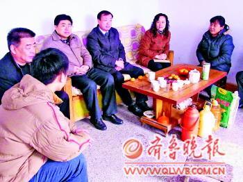 | 济南大学副校长张硕秋(右二)、平阴县委副书记刘业朝(右三)等在贫困生家中“家访”。 本报记者 杨凡 摄