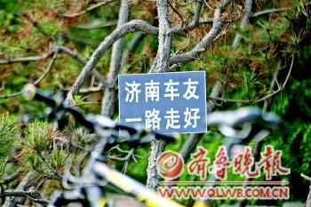 | 24日,几名烟台车友在事发地点挂上“济南车友,一路走好”悼念牌。