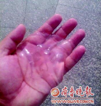 | ▲五四广场附近大量水母出没。(照片由市民王女士提供) |  | ◥只有巴掌大小的水母。(照片由市民王女士提供) |