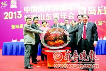 | 与会领导共同按下水晶球启动活动。 |  | 第一批上海包机团客人们抵达青岛海泉湾度假区,“2013好客山东·向海泉湾出发万人游”活动拉开帷幕。 |