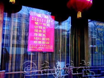 | 某饭店门前显眼位置打出了招聘广告。本报记者 秦昕 摄 |