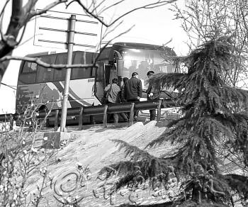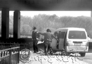 | ▲几名等车的乘客进入黄牛的面包车。 |  | ▲“黄牛”开面包车将乘客带到高速路附近。 |  | ▲在“黄牛”的带领下,乘客爬上高速路,上了一辆开往菏泽的长途车。 |