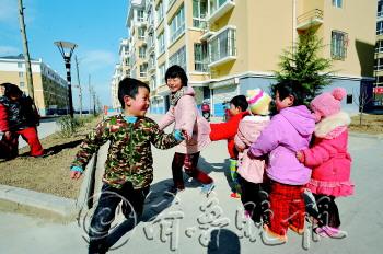 | 从农村住进社区的孩子们过上了城里般的生活,图为商河玉南社区的孩子在做游戏。(资料片)本报记者 张中 摄 |