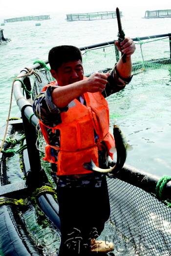 文/片 本报记者 潘旭业 休渔期到来后,岛城所有渔船都停港“休息”,禁止出海捕鱼,岛城是否还有足够的海鲜供应?3日,记者跟随开发区海洋与渔业局工作人员,探访青岛市最大的经济鱼类海上养殖基地。据了解,这里深海养殖了100多万斤的经济鱼类,随时可以上市,满足市场需求。随着海产养殖业发展,该基地还将新增300个深水网箱,年增加成品鱼600多万斤。 深海网箱养出无污染“野生”鱼 3日,记者跟随青岛开发区海洋与渔业局工作人员来到位于薛家岛石岭子礁附近海域的鲁海丰生态渔业示范基地,这里是青岛市最大的经济鱼类海上养殖基地。该基地负责人薛清海告诉记者,目前养殖区拥有深水抗风浪网箱55个,主要养殖黑头、鲈鱼、黄鱼、牙鲆、美国红鱼、海参、鲍鱼等鱼类和贝壳类等海产品。 在薛清海的带领下,记者乘坐养殖船经过十多分钟航行,来到距离码头1000多米的深水网箱养殖区,几十个巨大的网箱漂在海面上,每个网箱上都罩着鱼网。“一个深水网箱周长40米,网箱水下有7米深,约800多立方米,养殖着两万多斤鱼,现在这些鱼随时可以上市。”薛清海说,“这片养殖海域的水深20多米,属于黄海海域,水流急、无污染,在这里养殖的鱼跟野生的没什么区别。” 休渔后销售量大涨三四倍 据介绍,鲁海丰生态渔业示范基地的鱼类养殖采取立体养殖法。“我们根据不同鱼类的生活习性,将黄鱼、黑头、鲈鱼放在一起混养,这样可以合理利用深水网箱的空间,最大限度地养殖更多的鱼。”薛清海告诉记者,“黄鱼喜欢在底层生活,黑头经常在中下部游弋,鲈鱼都在中上部活动。投放的鱼饵都是鲈鱼和黑头鱼先吃,黄鱼在下面‘捡漏’,这样搭配起来,投放的饵料也不会浪费。” 工作人员将罩在深水网箱上面的渔网掀开后,开始拿起铁锨将鱼、面条鱼等饵料投放进深水网箱。“这些深水网箱里养殖的鱼每天仅投放鱼饵就要5吨,都是野生的小杂鱼。由于成本高,我们的售价也较市场上卖的鱼价格高,主要供应酒店使用。”鲁海丰生态渔业示范基地工作人员薛光忠说,“这些饵料都是公司的远洋船队到外海捕捞回来的,都集中存放在冷库内。” 薛清海告诉记者,当休渔期未到时,由于出海渔民打上来的鱼较多,再加上南方运来的海鲜的冲击,这里每周出售的鱼仅有4000多斤。休渔期虽然刚开始两天,需求量明显增加,共销售5000多斤。“这两天每天早上五六点钟就有鱼贩子和饭店采购员排队在这等着买鱼。由于刚刚休渔,很多店里现在还有些存货,等休渔时间一长,销售量还要多。”薛海清说。 将再增加600万斤养殖量的深水网箱 随着近海渔业资源的匮乏,养殖海鲜的需求量得到迅速增长。据了解,鲁海丰集团还要继续扩大规模,新增300个深水网箱。这就意味着将年增成品鱼600多万斤,成为岛城休渔期间重要补给。 “养殖海鲜有个好处就是不受季节影响,也没有休渔期,春夏秋冬都可以满足客户的需要。”薛清海说,此外,鲁海丰生态渔业示范基地基地还正在建设人工鱼礁项目,通过扩大礁区大型藻类种植规模,有效改善礁区生态环境,建设人工海底森林来吸引鱼群。