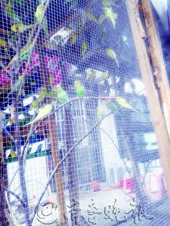 | 鹦鹉集中养在一楼的阳台上。范少伟 摄 |  | 笼子里的鹦鹉很多。范少伟 摄 |