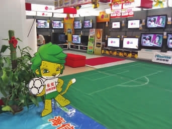 在省城国美、苏宁等家电卖场,吉祥物标签从电梯延伸到销售区。创维等彩电品牌的销售区域铺上了地毯,地毯上的图案则是一个小型的足球场。某知名电视品牌的销售员告诉记者,近段时间,前来购买电视的顾客中,咨询球赛画质的占了相当比例。