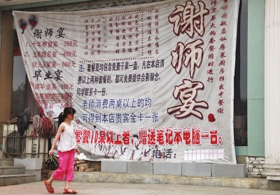 22日,一个女孩在聊城市区一家酒店的大型“谢师宴”宣传画前走过。高考分数即将公布,市区各酒店纷纷推出“谢师宴”。教育专家认为,学生请老师吃饭无可非议,但感念师恩更多应倾向精神层面。