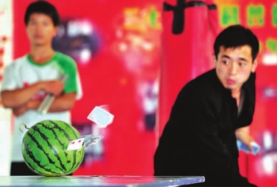 更绝的还在后头。助手拿来了一个大西瓜,“嗖嗖嗖……”一副牌飞出去,一大半都插进了西瓜里,少数扑克牌擦着西瓜皮飞出,撞在墙上后碎裂,可见力道之足。
