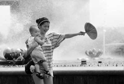 28日济南泉城广场喷泉前一位年轻的女士抱着可爱的宝宝享受喷泉带来的凉爽 本报记者王媛摄
