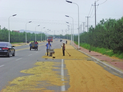 28日上午,威海城区沈阳南路上,长约两公里的路段变成了晒麦场,过往车辆只能绕麦行驶。在摊开的麦子周围围有砖头、石块以及松枝等障碍物,导致自行车、行人与机动车混行。公路晾晒麦子容易引发交通事故,更容易弄脏麦子。