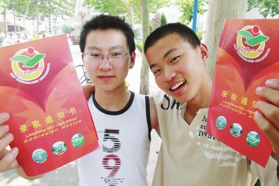 6月28日上午,聊城市初三学业水平考试(简称学考)成绩公布,各高中录取分数线同时划定,不少考生也已经领到了录取通知书。图①聊城一中成绩公布处,家长和孩子正查看成绩及录取情况。图②考生赵衣飞(左一)和陈超领到了聊城一中的录取通知书。本报记者 李军 摄
