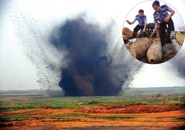 17日19时,济南市公安局在某销毁场地销毁了197件爆炸物。这批爆炸物主要是近两个月以来发现的战争年代遗留的各式炸弹、炮弹、地雷、手榴弹等,其中最大的一枚是美制500磅的航空炸弹,破坏半径可达500米。