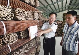 18日,济宁检验检疫局工作人员正在对鱼台一企业生产的柳帘进行现场检验。据了解,草柳编是当地重点扶持的产业,产品畅销美国、欧盟等10多个国家。据济宁检验检疫局数据显示,2010年1B8月份草柳编出口量1827吨,货值158.86万美元,货值同比增长16.63%。 本报记者张晓科 李倩 通讯员 陈士彦