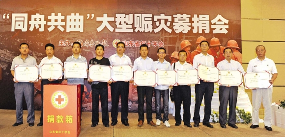 17日的赈灾募捐会现场,有一片美丽的橘红色———8位身着橘红色校服的山东协和职业技术学院学生代表在院长盛振文带领下,赶来捐款2万元。“2万元钱虽不多,可代表着我们万余名师生的心意,这两天学校不断收到暑假放假在家的老师和学生询问捐款事宜的电话。”盛院长说。