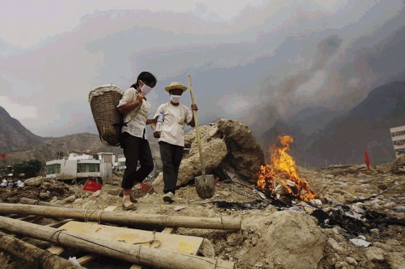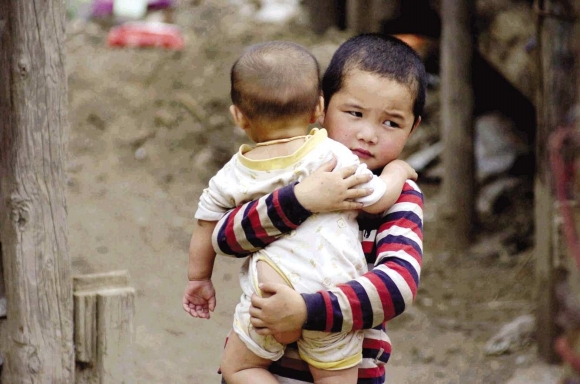 10日,甘肃舟曲泥石流现场,6岁的哥哥抱着1岁的弟弟在废墟中穿行。
