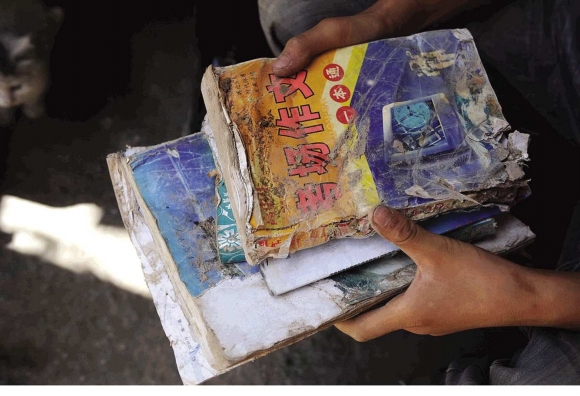 15岁的惠仇姓在舟曲泥石流灾害中失去了父母,废墟中,他只找回了自己的这几本课本和父亲的身份证。 本报记者周青先摄