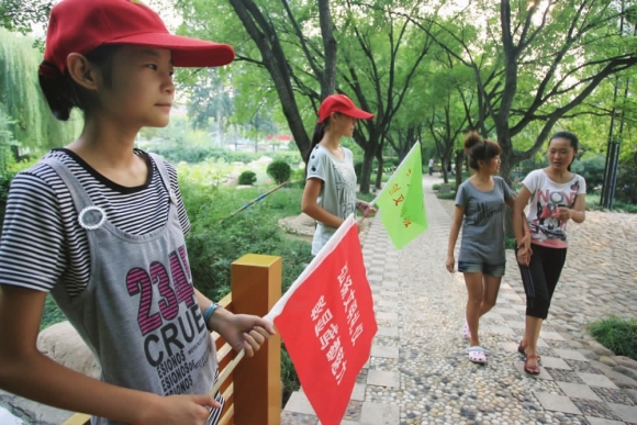 18日,在潍坊市人民公园,几名小志愿者正在执勤。据了解,这些小志愿者来自大庄子社区,每天都会到公园内执勤,主要是对一些市民游园时的不文明行为进行劝导。