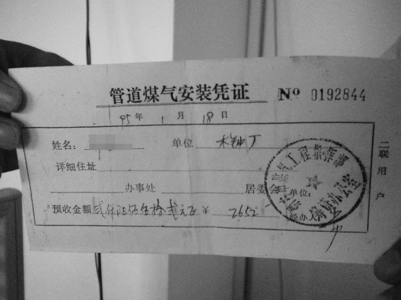 8月13日,记者跟随隋先生来到他家,隋先生所在的居民楼是一梯三户的格局。隋先生告诉记者,1995年他们楼每家都交了2652元的管道煤气(后改为天然气)投资费,随后同一层的东西两户都安上了管道天然气,但他家一直没法安。隋先生告诉记者,虽然同处一层楼,但是左右邻居家都有阳台,天然气管道可从前面阳台窗口直接通到家里。而他家位于中间,前面没有阳台,同样的方法无法在他家使用。燃气公司让他协商邻居,从邻居家接一条管道,但是邻居不同意,后来隋先生协商通了一位5楼的邻居,但燃气公司不同意由上往下走管。