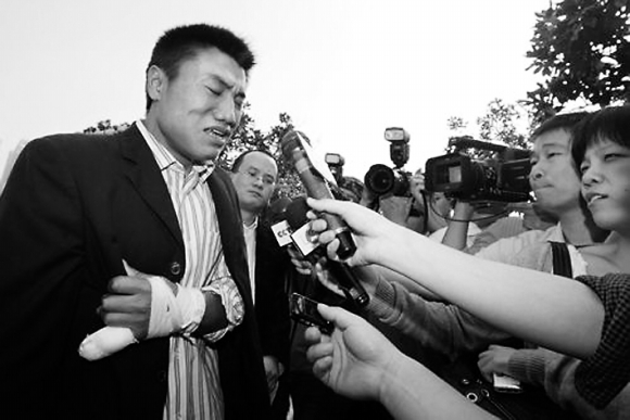 “当我看到的时候,4个人的小指都少了一截,还在不断地滴血。我问别人,他们这是怎么了?周围的人告诉我,‘你没见他们身边的菜刀吗?自己切的’。‘那指头呢?’‘吞下去了’。”据目击者称,4人面前当时还摆着白纸,上面写有8个红色大字“我没旷工,还我清白”。