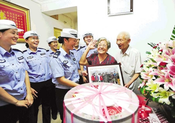 8月18日,农历七月初九,家住经七纬一附近的真文老人正值80岁的生日,市中区交警大队女子中队的交警们专门赶来给老人