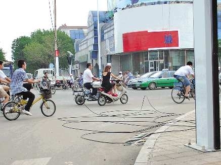 垂落在路边的线缆。 本报见习记者 牟张涛摄