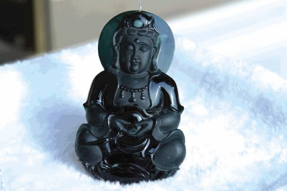 鉴赏:墨翠在宝石学中属于绿辉石族。这件作品颜色纯正,墨中透绿,种好水足,符合墨翠的质地评价标准。雕工方面,由于墨翠具辟邪效用,故选择宗教题材,观音面部刻画细腻,法相庄严又不失慈爱,冠部俏色为点睛之笔。雕刻时采用高光与磨砂处理相结合的方式,使整体协调性佳,突出视觉效果。墨翠近年市场价格持续上扬,因此这件作品具有投资及收藏价值,有一定升值空间。 (轩辕龙曦)
