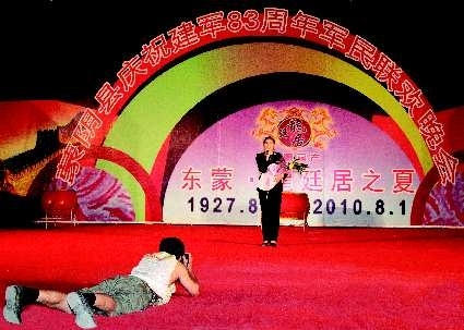 时间:2O1O年?月29日晚;地点:蒙阴县城城北广场;自述:蒙阴县庆祝建军83周年军民联欢晚会军旅歌手上台演唱时,一影友趴在舞台仰拍。点评:瞧这位老哥,摄◇女像打“靶”。影友:公茂栋 摄(乐拍奖50元)