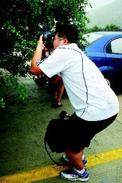 时间:2OO9年?月8日;地点:枣庄万亩石榴园;自述:刚刚下完雨后,一位影友怕摄影包放在地上弄湿了,于是用双膝夹住,翘着屁股,然后拍摄。点评:欲与天公比◇高。