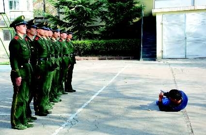 时间:2OO8年1O月24日;地点:蒙阴武警中队;描述:为拍摄训练的武警,这名摄影师仰躺在地上拍摄照片,敬业精神可嘉。点评:仰@摄“天”,独步江湖。影友:戴存满 摄(乐拍奖40元)