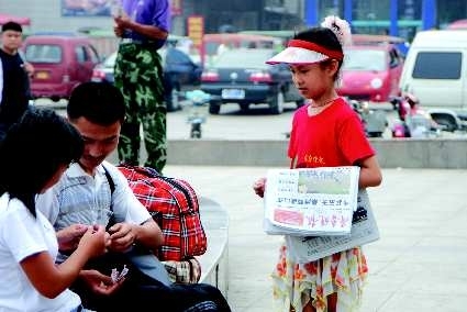 19日,“报童营销秀”第三期的活动进入第四天,当天小选手们共售出报纸1810份。图为小选手高新◇成功地向一对情侣售出报纸。