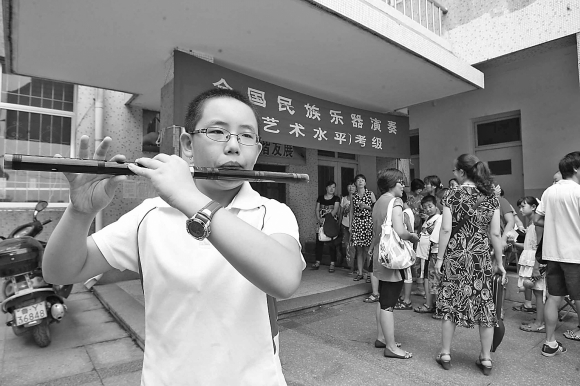 19日,一名小学生正在考试前加紧练习笛子。当日,全国民族乐器演奏(艺术水平)考级在烟台芝罘区养正小学举行,吸引了全市不少小学生乐器爱好者前来考级。