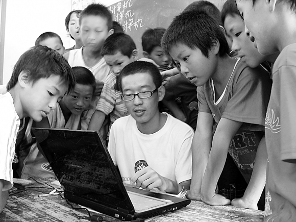 除了认真负责地为孩子们教授英语、趣味数学、计算机、地理、诗词鉴赏等方面的知识外,队员们还即兴介绍了电脑、世博、数码产品等孩子们眼中的新奇玩意儿。当吉晓禄同学在教室里打开笔记本电脑向学生们展示计算机的操作时,这些从来都没有接触过电脑的山里孩子,一个个伸长了脖子。当分组上台实际操作的时候,孩子们里三层外三层地把支教队员围了起来。