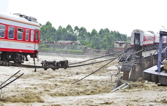 8月19日15时15分许,宝成铁路德阳至广汉间石亭江大桥倾斜。从西安开往昆明的K165次列车两节车厢掉进石亭江,被洪水冲出200米远,幸无人员伤亡。 新华社发