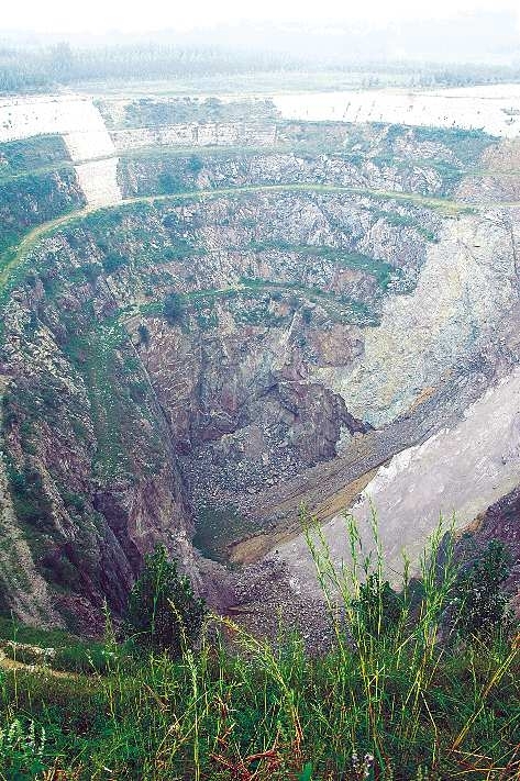 记者看到,该矿坑裸露在外面,呈圆锥形,自上而下五道螺旋圈盘旋而上,从坑口往下望,有一种眩晕的感觉。