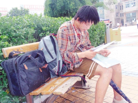 丁坚正在聊城汽车总站站前广场的椅子上唱《母亲》。记者杨淑君摄