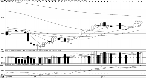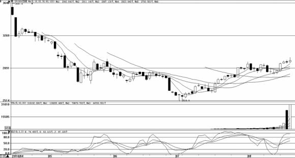 截至收盘,主力合约收于2981.6点,上涨17.2点,涨幅为0.58%,两远月合约表现稍强于近月合约。昨日四合约成交量超过33万,而持仓量再度创下新高,达到35786手。技术面,IF1009合约收于带上长影的小阳线,成功站在各均线之上,5日均线上穿10均线形成金叉,说明近期仍有足够的上冲动能,但尾盘量能略显不足,逐渐缩小,这也是尾盘出现回落的原因之一。