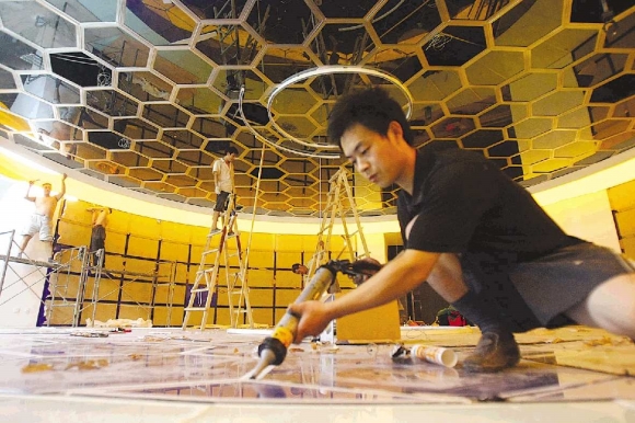19日上午,施工人员正在“太阳城”主会馆的中心大厅进行装修。据了解,太阳能科技博览馆新馆