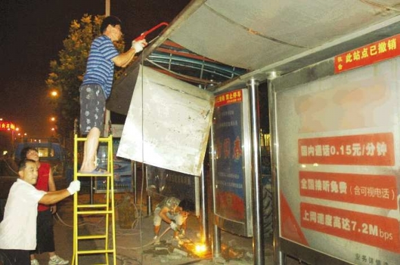 8月18日夜,德州市城管部门对湖滨大道上已经停用的6个公交站牌进行拆除。