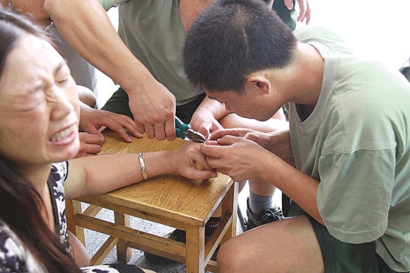 当消防队员看到肿胀的手指时,也倒吸了一口冷气。手指上的脓包已经成透明状。了解到戒指是白金材质的,消防队员先将一个小纸片掂在戒指与手指之间,然后用鱼嘴钳慢慢剪出了一个小缺口。剪开之后,两名消防员利用两个钳子慢慢扩大戒指上的缝隙,不到十分钟,戒指就被取了下来。