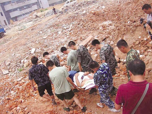 记者一路跟随救援队伍,从三楼上将老人抬上救护车时,时间已经是5时20分,事后老人的女婿告诉记者,老人中午时曾专门找到施工方表示,拆楼不要紧但不要将楼道给堵了,结果下午2点多,老人听见轰地一声,感觉不对就下楼去看,结果一辆挖掘机正在拆墙,紧接着又一堵墙在老人眼前轰然倒下,老人接着捂着胸口走了上来,一句话也说不出来,他看情况不好拨打了急救电话。本想下楼去找人,结果他走到楼梯口发现,楼内唯一的通道被拆倒的墙给堵了。