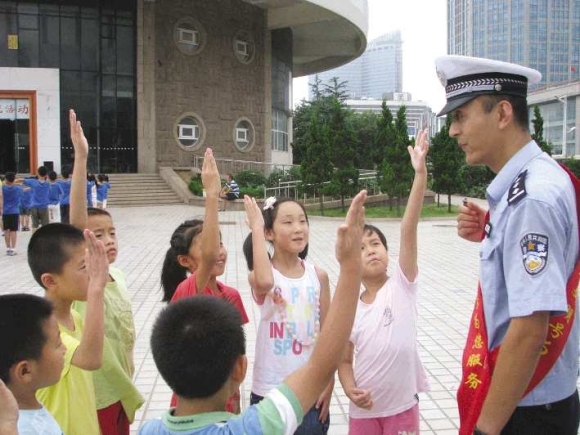 19日下午,全市300余名小学生来到青岛市妇女儿童活动中心,参加“交通安全一日营”活动。活动中,市南交警香港西路中队的民警教授了交通指挥手势,带领他们参观了122指挥中心,并来到街头,劝阻不文明交通行为。图为小学生在踊跃回答有关交通知识的问题。