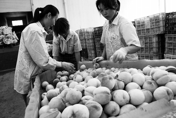 “这些都是前来送黄桃的当地农民,我们通过合作社的方式给他们一个保底的价格,保证我们罐头原料的供应。”奇伟食品有限公司生产经理王守田,指着大院里排队送桃子的农民对记者说道。顺着他指的方向望去,前来送桃子的车队排成长龙,车上的水果筐里装满了刚上市的黄桃,并按个头大小整齐排列,接货的厂里员工正忙着称重、分类。