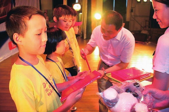 19日,在泰安市图书馆东楼二楼报告厅,东风日产嘉信专营店董事长赵洪林(右一)向报童颁发证书。当日,“齐鲁晚报·嘉信东风日产杯报童营销秀”第二期颁奖仪式举行,参与第一期和第二期活动的500多名报童和家长共同见证了收获的时刻。 本报记者 陈琳 摄