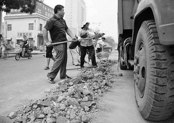 19日晨,在东岳大街与傲徕峰路十字路口处,长达200米的渣土夹杂着大量的石块散落在泰安的交通主干道上,使得交通尤其拥堵。10位环卫工人连续清理了6个小时才将该路段清理干净。环卫四所所长张仁估计,这堆渣土有十四五吨。本报记者 陈琳 摄