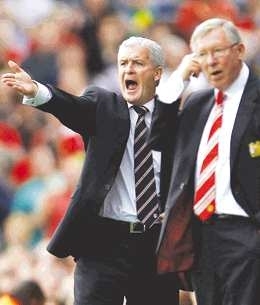 8月22日,富勒姆队主帅休斯(左)与曼联队主帅弗格森在场边观战。当日,在英超第二轮比赛中,曼联队客场以2:2战平富勒姆队。新华社发
