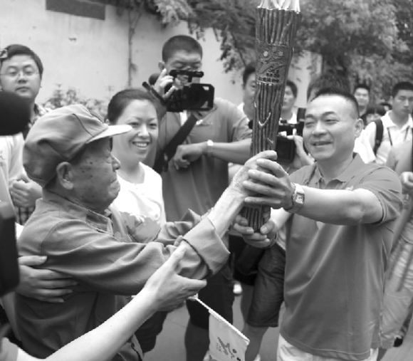 莒南县有关负责同志首先从火种灯中引出火种,并点燃了火把。担任第一棒火把传递的是奥运会冠军楼云,楼云高擎火把,在圣火护卫人员的簇拥下,从主席台跑到八路军一一五师司令部旧址门口,将火把交给老红军代表宁学武;宁学武满怀激动的心情,在楼云的帮助下展示火把。少先队员王浩接过火把后,跑到八路军一一五师司令部旧址院内纪念碑前,点燃了第二棒火把手、山东省劳动模范徐长青手中的火把。徐长青手持火把交给红嫂代表尹德美……