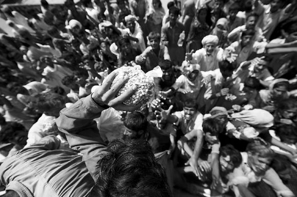 8月23日,在巴基斯坦旁遮普省南部穆扎法加尔附近的洪灾地区,灾民争抢救济粮食。