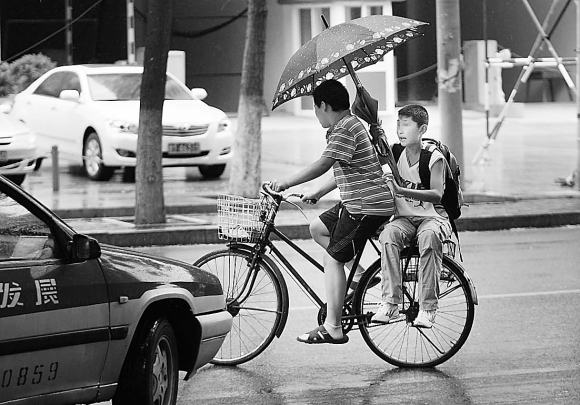 23日上午,烟台市区下起淅淅沥沥的小雨,在西南河路,两名少年骑车前行。坐在后边的少年给前边骑车的少年撑伞遮雨,伞放得过低,挡住了骑车少年的视线,险些与正在行驶的一辆出租车相撞。