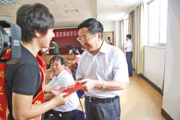 威海市副市长梁良为特困高考新生发放救助金。本报记者 许君丽摄
