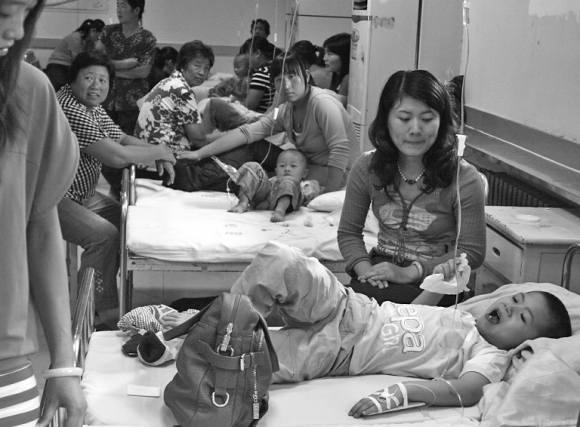 23日,湖北社区卫生服务站许多孩子在打吊瓶。据卫生服务站